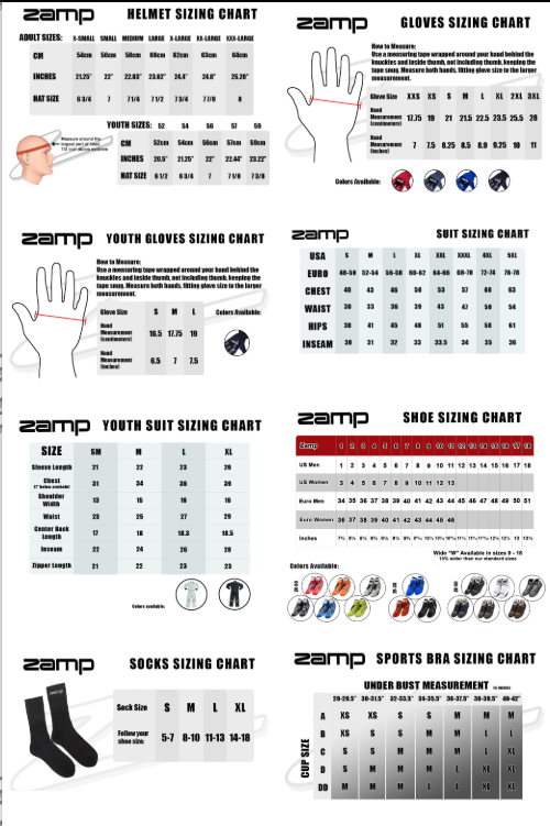 Sizing Charts for Suits, Gloves, Boots, Helmets, Socks and Bras. Click Here